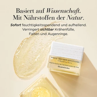 Basiert auf Wissenschaft. Mit Nährstoffen der Natur. White Tea Skin Solutions Brightening Eye Gel, unterstützt durch EGCG*, revitalisiert müde Augen sofort und sorgt für einen strahlenden, wachen Blick. Mit über 2.000** kostbaren Mikrotröpfchen verschmilzt diese erfrischende Gel-Creme mit der Haut, um die zarte Augenpartie mit Feuchtigkeit zu versorgen, sie aufzuhellen und sie zu beruhigen. Die sanfte und dennoch wirksame Formel mit See-Eichen-Extrakt, bekämpft Augenringe, mindert Krähenfüße, dunkle Augenringe und sogar hartnäckige Fältchen. In nur einer Woche fühlt sich die Augenpartie straffer an, sieht jugendlich und strahlend aus. ***Sanft genug für alle Hauttypen, auch für empfindliche Haut.****Vegan. *Epigallocatechin-Gallat-Glucosid, ein aktives Molekül des Weißen Tees. **In jedem 15ml-Tiegel. ***Basierend auf einer Verbraucherstudie mit 69 Frauen im Alter von 25-60 Jahren, nach 1 Woche Anwendung, einschließlich derjenigen mit selbst empfindlicher Haut. ****Selbstwahrnehmung