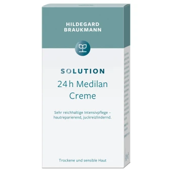 Für trockene, besonders trockene sowie angegriffene Haut (trockene Ekzeme, Neurodermitis, Psoriasis). 24h Medilan Creme wirkt spürbar hautreparierend, hautglättend und hautberuhigend durch die Kombination von medizinischem Lanolin (Medilan) mit dem Extrakt der Ballonrebe. Das biomimetisch aktive Medilan stärkt die Hautregeneration, ergänzt fehlende Hautlipide und speichert langfristig Feuchtigkeit in der Haut. Ohne synthetische Konservierungsmittel. Enthält Duftstoffe pflanzlichen Ursprungs mit konservierenden Eigenschaften.